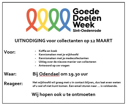 Bij alle huizen in Sint-Oedenrode wordt regelmatig aangebeld voor een collecte. Vaak op een tijdstip dat dit niet erg gelegen is. Stichting Goede Doelen Week Sint-Oedenrode komt daarom met een oplossing. Er komt één gezamenlijke collecte voor een groot aantal goede doelen. In andere gemeenten werkt deze werkwijze al zeer succesvol.
